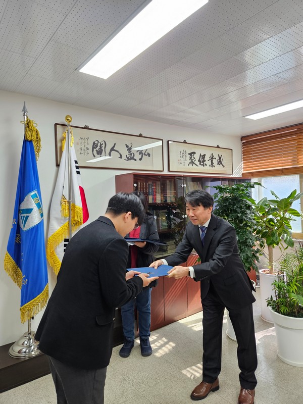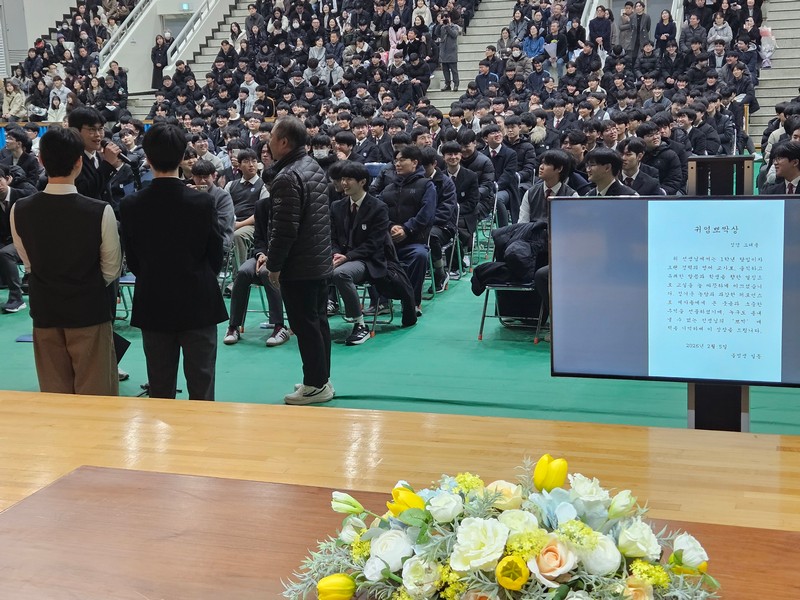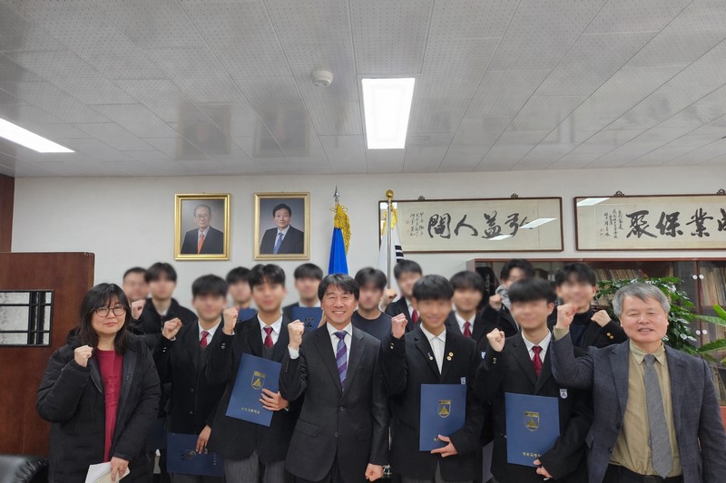 3. 2025년도 2학기 동문 장학금 수여 총동창회는 지난 2월 9일(월) 모교 호림관 교장실에서 2025학년도 2학기 장학금 수여식을 갖고 재학생 및 졸업생 13명에게 동문장학금을 수여했습니다. 내역별로 보면 동창회장학금이 학년당 2명씩 모두 6명(졸업생 2명 포함)에게 수여됐으며 박한우 동문(1기)의 기부로 조성된 ‘박한우장학금’이 2학년생 1명에게, 2022년 한 8기 동문이 기부한 장학금(편의상 ‘8기장학금’이라고 부르겠습니다)이 1학년생 2명에게 각각 전달됐습니다. 이용호 동문(1기)이 출연한 ‘이용호장학금’은 ‘동물을 사랑하고 생명을 존중하는 학문분야에 진학하는’이라는 지급요건에 따라 관련 학과 진학이 결정된 42기 졸업생 4명에게 전달됐습니다. 동문장학금 조성액은 지난해 박한우 동문과 익명을 부탁한 1기 동문 한 명이 졸업 40주년을 기념해 각각 1000만원을 추가로 기탁해 총계 1억7600만원입니다. 지난해말까지 9554만2000원이 지급됐으며 이번 2학기분(700만원)을 포함해 모두 1억254만원이 수여됐습니다. 잔액은 7346만원입니다. 동문장학금은 향후 2년내 고갈될 것으로 우려되고 있어 동문 여러분의 관심과 참여를 당부드립니다.