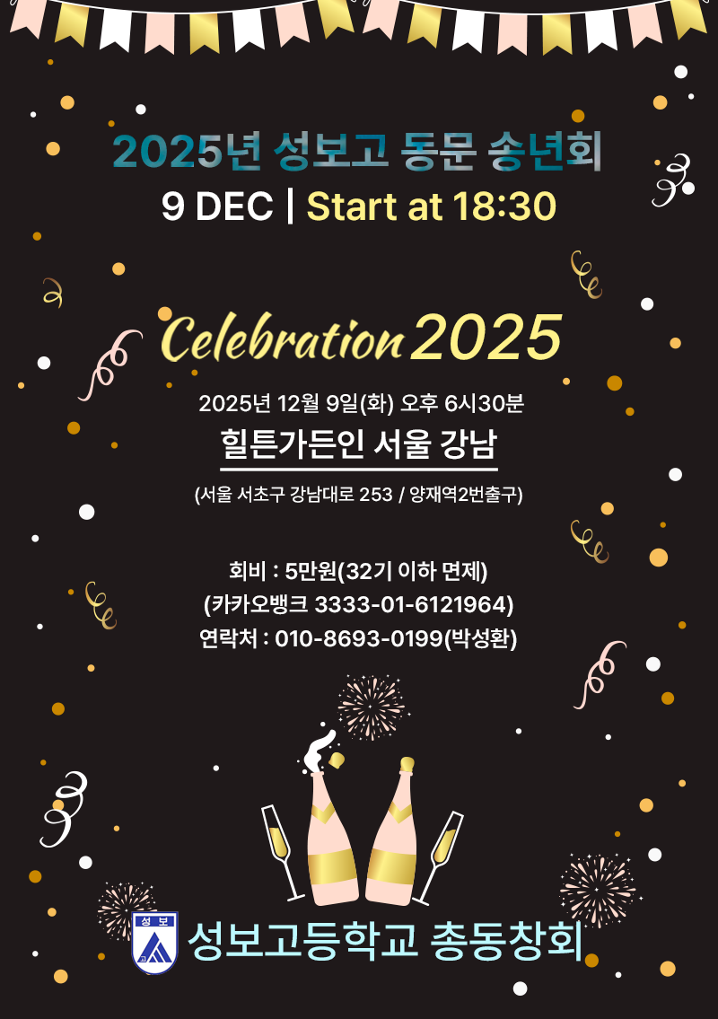 [성보고 동문 12월 송년회] -일시: 12월 9일(화) 오후 6시30분 -장소 : 힐튼가든인서울강남 (https://www.hilton.com/ko/hotels/selgigi-hilton-garden-inn-seoul-gangnam/) -회비: 5만원(카카오뱅크 3333-01-6121964 박성환(성보고총동창회행사회비), 32기 이하는 면제) -참가신청: 인원예약을 해야 하므로 링크(https://forms.gle/Yi7Y9rBq9VsnSd8P9)에 접속해 신청하기 바랍니다.