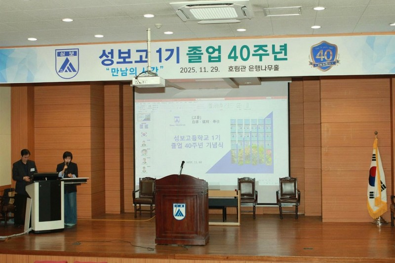 2. 1기 졸업 40주년 기념행사 성황리에 열려…장학금 기탁도 성보고 1기 동기회(회장 한영배)는 올해로 졸업 40주년을 맞아 ‘성보 1기 졸업 40주년 만남의 시간’ 행사를 지난 11월 29일(토) 모교 호림관 은행나무홀에서 개최했습니다. 연인원 50여명(후원금 납부 포함 82명)이 참여해 기념식, 기념공연, 뒷풀이(인근 식당) 등을 진행했습니다. 한영배 1기 회장은 기념사에서 “졸업 40주년을 계기로 새로운 출발을 시작하는 1기 동기들 간 친밀한 교류가 지속적으로 이뤄지게 노력하겠다”라고 말했습니다. 황병덕 모교 교장선생님과 장원준 학생회장은 축사를 해주셨습니다. 총동창회는 1기 동기회와 긴밀히 협력하며 행사 개최를 지원했습니다. 이번 행사에서 박한우 동문이 1000만원의 장학금을 추가로 기탁했고 이름을 밝히기 원치 않는 다른 1기 동문도 1000만원의 장학금을 모교에 맡겼습니다. 졸업 40주년 행사를 개최한 1기 동기회와 후배 사랑으로 거액을 기탁한 두 분의 1기 동문에게 이 자리를 빌어 깊이 감사드립니다.